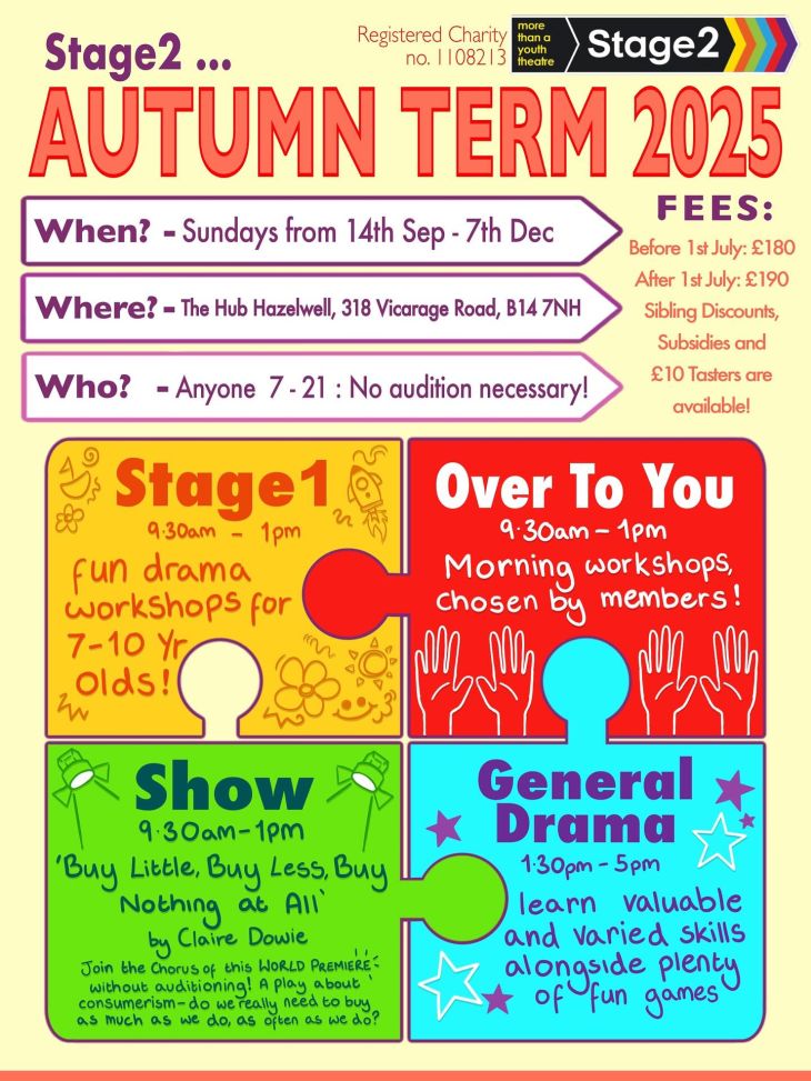 STAGE2 AUTUMN TERM 2025 14th September – 7th December, no sessions 26th October Contact us at info@ stage2.org or 07951 122932 Feel free to come and try a taster for a...